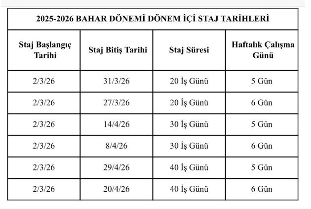 BAHAR DÖNEMİNDE DÖNEM İÇERİSİ STAJ YAPACAKLARIN DİKKATİNE... STAJ YAPACAK ÖĞRENCİLERİMİZİN, EVRAK TESLİMİNİ BU EKTEKİ TARİHLERE GÖRE EN GEÇ 25 ŞUBAT 2026 TARİHİNE KADAR GETİRMELERİGEREKMEKTEDİR 16.02.2026 Okunma Sayısı : 9